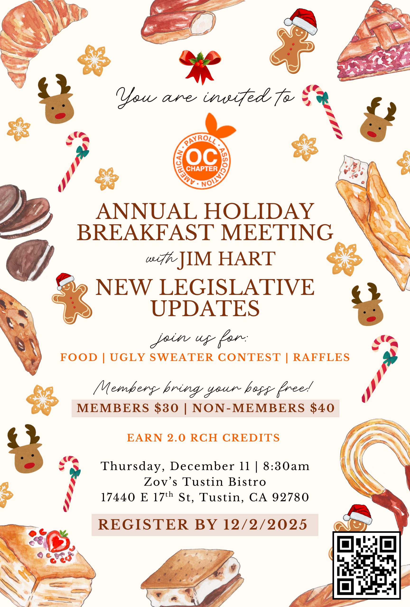 Zov's 17440 E. 17th St., Tustin, CA, United StatesTHE MEETING EVERYONE'S TALKING ABOUT. The OCCAPA Community is buzzing about our Annual Holiday Breakfast Meeting at Zov's Bistro Tustin. Join us and celebrate our payroll community. RSVP as seating is limited. Save your spot and reserve early — Bring a friend – Members can bring their boss for free. Network and earn 2 RCHs.